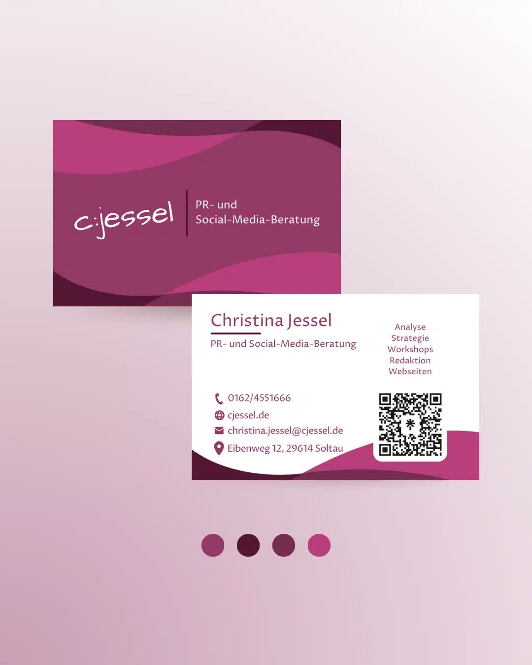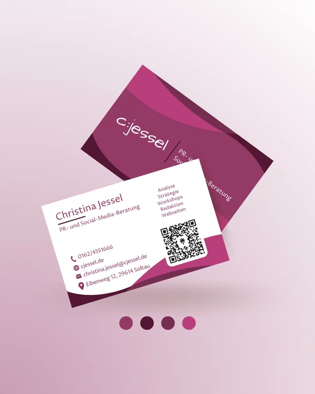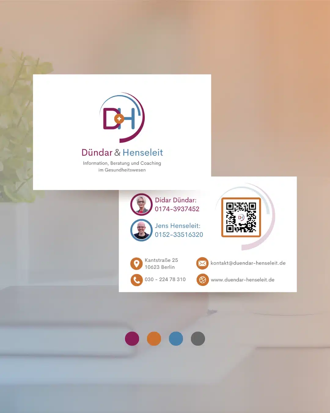 Meine Unterstützung erhielt sie im Bereich Printmedien-Design: Mit ihren neuen Visitenkarten, passend zu Ihren bereits bestehenden Branding-Farben, bleibt Sie bei Ihren zukünftigen Geschäftspartnern und Kunden im Gedächtnis.